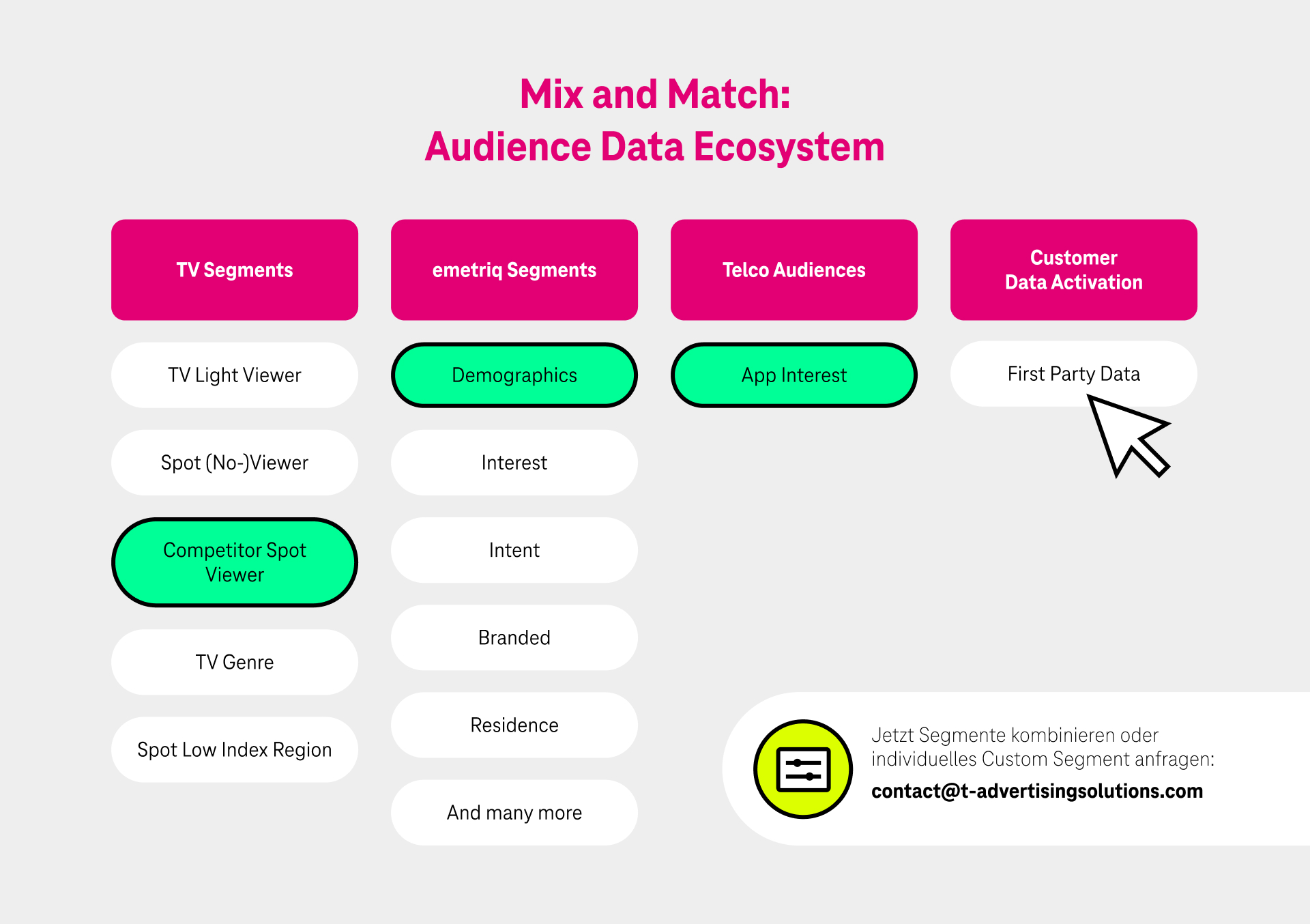 Exklusive TV-Segmente skalieren deine TV-Kampagne nahtlos ins Open-Web: Auf Basis von TV-Nutzungsverhalten adressierst du gezielt Non-Spot-Viewer, TV-Wenigseher, nutzt strategisches Competitor Targeting oder erreichst Fans von über 50 TV-Genres. Mit über 600 präzisen Segmenten adressierst du Soziodemografie, Interessen und Intent – extern validiert von AudienceProject. Erreiche so deine Zielgruppen effektiver als je zuvor.